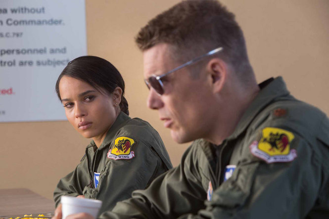 The film benefits from a strong presence of strong female characters. January Jones doesn’t have much dramatic range as an actress, but she’s decent enough as Mrs. Egan, Thomas’ detached and love lost wife. And Zoe Kravitz, to no surprise, is just splendid. She’s Vera Suarez, the newest member of Egan’s flight team and the conscious of the entire film. That’s a lot of weight for a minor character to hold, but Kravitz has such natural skill and screen persona that she capably pulls it off. She is Good Kill’s lone voice of reason. The representative figure of action vs. hesitance, preemptive behavior vs. reactionary, asking questions vs. taking orders. It’s the kind of necessary subtext missing altogether in a film like American Sniper. That’s not to say Good Kill is that much better. But when the moment matters most, it at least gets close enough to its target to raise our own levels of awareness. It makes you alert.