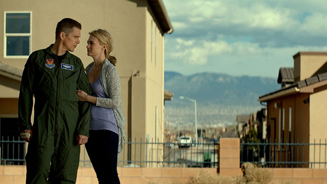 The transformative Ethan Hawke stars as Thomas Egan. He’s one of the best pilots around, but lack of in air demand and a wife wanting her husband back moves him towards the stationary field of UAV. He drinks – heavily – often manning the drones continents away while heavily buzzed. The devil’s water numbs Egan’s pain. He’s a man of the skies but can’t fly. He’s a man with a moral code but blasts away nameless victims with little to no emotion. The separation from battle leads to a separation from himself and his identity, and the trauma of defenseless point and shoot warfare begins to change him as a person.