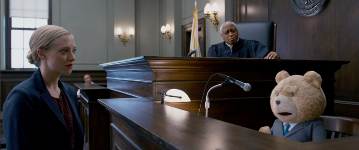We start 6 months after the events of the last film. Ted (voiced by Seth MacFarlane) gets hitched to the love of his life Tami-Lynn (Jessica Barth). Life is good with his gum-chomping wife. But flash forward one year and the honeymoon phase is over. In one of the rare amusing scenes, the two banter over money in their squatter of an apartment a la Stanley and Stella from A Streetcar Named Desire. It’s a funny bit. Ted’s remedy to the situation is both simple, and by his physically non-gendered nature, complicated. They’ll have a baby. What could possibly go wrong?