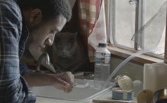 The movie has 5 characters. Sean (Ty Hickson) is the protagonist. His relative Cortez (Amari Cheatom) brings him groceries and supplies. Kaspar the cat plays Sean’s confidant. There’s an evil spirit in the wood. And lastly, I’d lump Sean’s red trailer and the wilderness together into one element with two faces: a welcoming hideaway dropped down in a castaway sea of fallen leaves and timber. We’re not sure how he got there or why, subjecting us to a shallowness and apparent improvisation rather than depth and characterization. It doesn’t take skill to make a film like The Alchemist Cookbook; it takes indulgence to the point of bordering on intemperance.