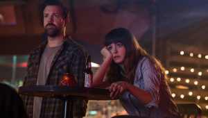 Gloria immediately runs across Oscar (Jason Sudeikis) upon her arrival in town. They were classmates in grade school, and while Oscar clearly has eyes for this woman, he never acts on the impulse. So instead they go to the family bar he now owns. Closing time ushers out the customers but doesn’t turn off the lights, with Oscar and his pals routinely drinking heavily until the early morning. Garth (Tim Blake Nelson) is a disheveled blabbermouth and Joel (Austin Stowell) plays the quiet good-looking guy. Gloria fits right in with this scaled down Cheers crowd after a few drinks. She even comes on as a server to help out Oscar. But after a long bender and a snooze on a park bench, Gloria awakens to find out that a giant monster has attacked South Korea’s capital city Seoul. At this point, you might be wondering what the film’s catch is. Well, she seems to be in control of the massive horned beast. Her self-destruction becomes visceral and tangible.