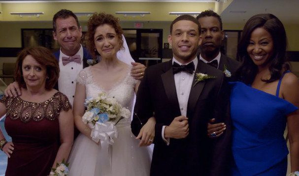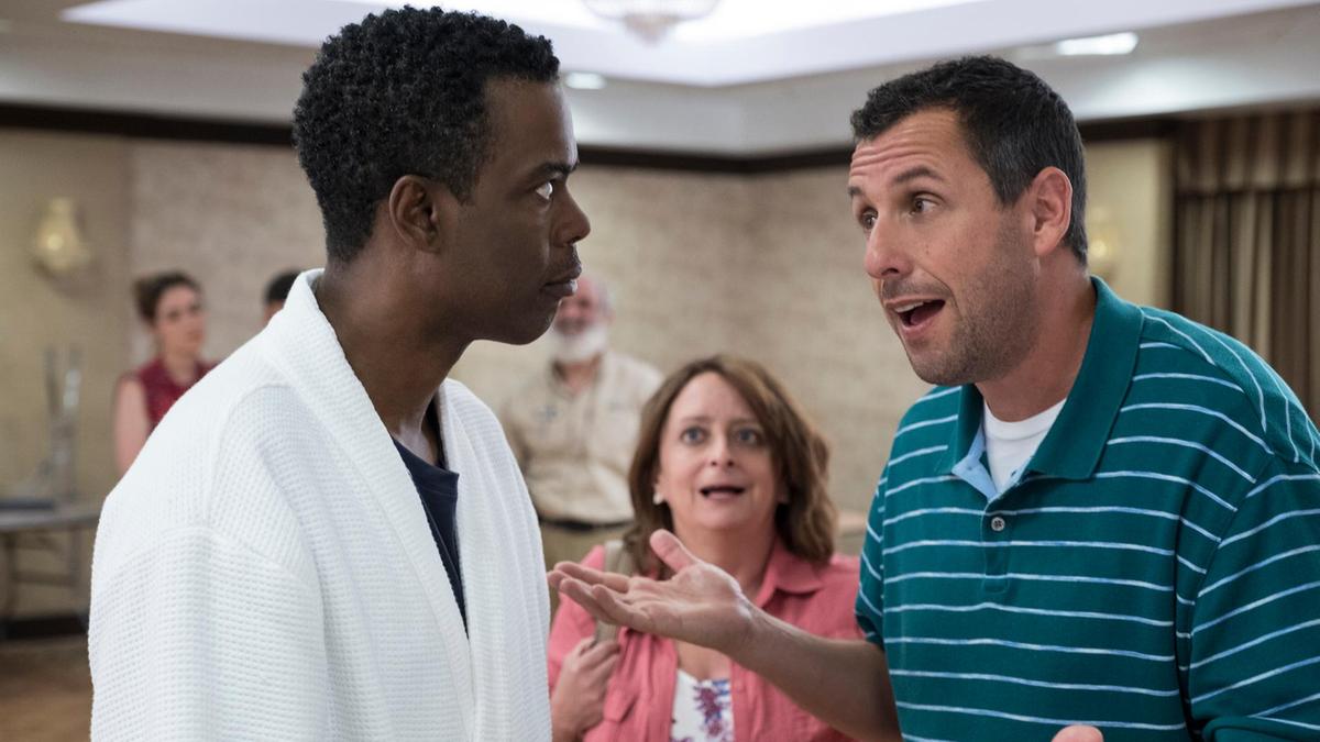 The Week Of operates on the scientific principles of Murphy’s Law, suggesting and showing through goofball antics and half-hearted sentiment that what can go wrong ultimately will go wrong, and it digs itself a ditch so deep and so wide that the side walls can’t be climbed to find the safety nets of intelligence. How do I describe the plot of this film? As the bride Sarah’s (Allison Strong) father, Kenny Lustig (Adam Sandler) is all of the Seven Dwarfs wrapped into one passive-aggressive patriarch, doing his tinniest, best Clark Griswold impression to sell himself as more than a small businessman. Kirby Cordice (Chris Rock) – who’d be Disney’s designated and R-rated Sleazy dwarf – is a surgeon whose wealth exists entirely in his checking account and is absent in his relationships, especially with his son and the groom Tyler (Roland Buck III).