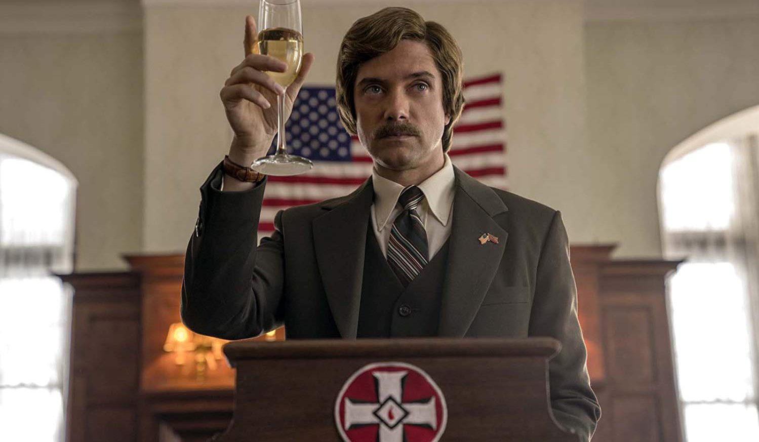 Things get more serious when Ron cold-calls the local KKK chapter. Because he’s a man of all people, and because his perfectly groomed afro gets to hide behind a rotary phone, his “white voice” convinces the other end that he’s down to join the cause. His new partner Flip Zimmerman (Adam Driver), a Jewish man who wears the Star of David around his neck, is tasked with playing Ron and proving his skin in this shared game by meeting the local skinheads. There’s the eager, chummy Walter (Ryan Eggold), this chapter’s President. Ivanhoe (Paul Walter Hauser) is a drunkard with a nicotine dip in his lip. Always skeptical is Felix (Jasper Pääkkönen), the most radical and committed to the cause, possibly even a purge. Flip passes the test though, convincing these radicals that he’s really Ron, going deeper and deeper undercover until he gets the “honor” of meeting the Grand Wizard himself, David Duke (Topher Grace). Duke is the scariest man in the film, much to the credit of Grace’s performance, because his three-piece suit and casual exterior normalize the hate burning inside him. This is a man who’s written his own kind of “Mein Kampf,” yet he looks like the guy you’d see in the front row of Church every Sunday morning. I find that terrifying, as should you.