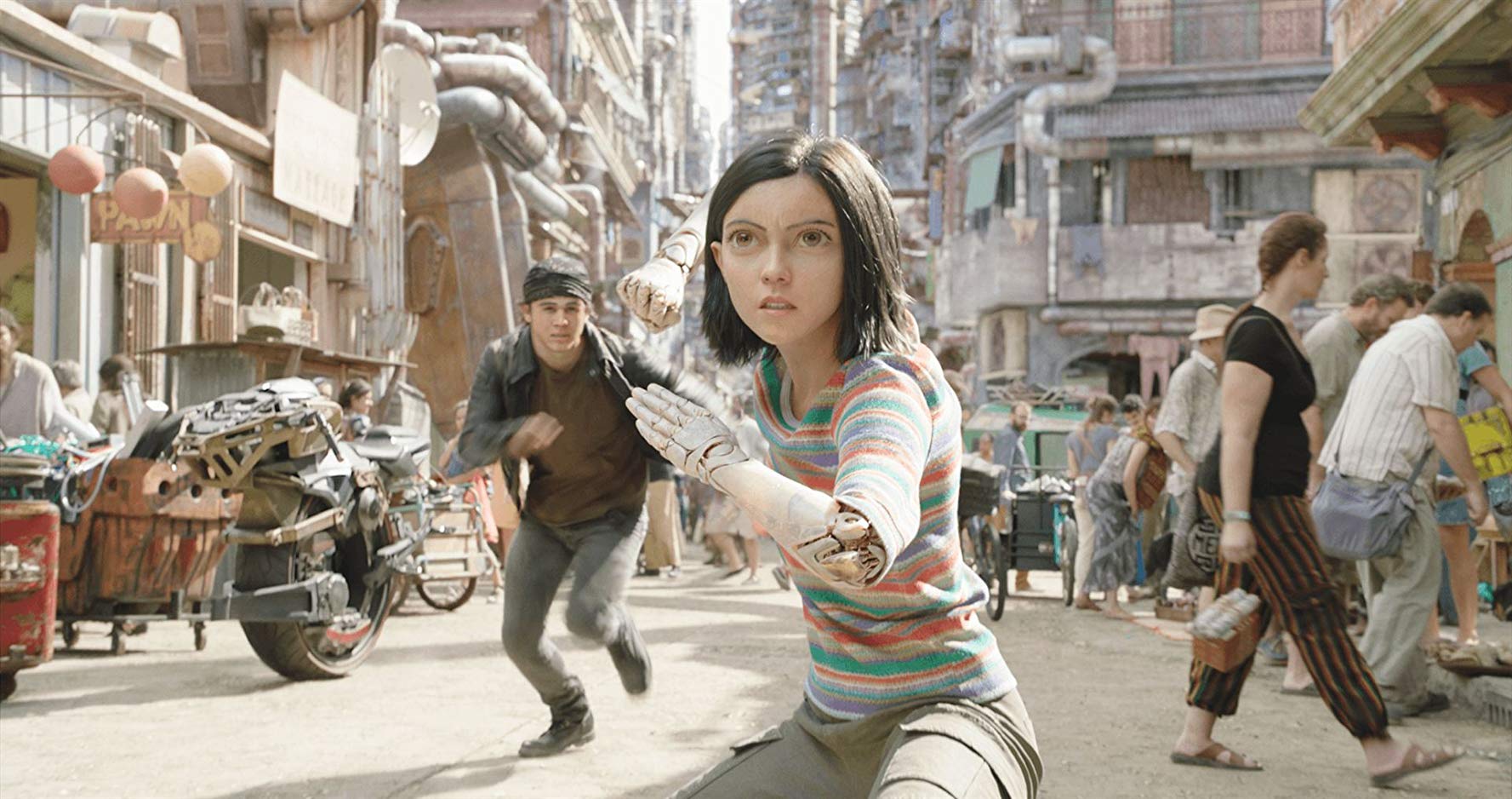 There are a few aspects where the film falls pretty short, but its exceptional world-building is far from being one of them. I believed the buildings, the cyborgs, the fumes and the smoke. And it’s easy to believe because the CGI seamlessly blends Alita (as well as the rest of the visually rendered characters) into the tangible production design. Even the augmented landscapes are convincing. What’s most important is that Alita’s eyes and emotions can sell a close-up shot; if those work, the rest of the movie will undoubtedly follow suit. Needless to say, Rosa Salazar delivers a knockout motion capture performance, infusing honesty through her expressions and movements and speaking patterns. Alita doesn’t look human, but because of Salazar, she certainly acts the part.