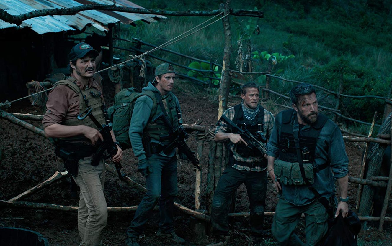 Santiago ‘Pope” Garcia (Oscar Isaac) spends his time in Columbia fighting the drug trade, gathering information from the informant Yovanna (Adria Arjona) as to the whereabouts of a kingpin named Lorea (Reynaldo Gallegos) in exchange for the safety of her brother. Back home, Pope assembles his past squadron under the pretense of strictly doing recon work. Tom ‘Redfly’ Davis (Ben Affleck) seems to relish inhabiting the role of team leader again, something more natural to him than failing as a lousy real estate agent. Pope recruits army motivational speaker William ‘Ironhead’ Miller (Charlie Hunnam) and his little brother Ben (Garret Hedlund), the group’s youngest member still battling his demons in the octagon as a cage fighter. Add in pilot Francisco ‘Catfish’ Morales (Pedro Pascal) and the old team is complete. They agree to do the recon, but little do they know that Pope intends to sucker them into a far more dangerous endeavor through sheer greed. He’s less saintly than his name implies.