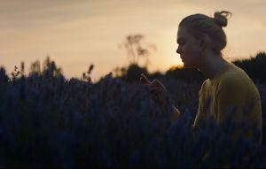 The Polish speaking Violet Valenski (Elle Fanning) looks to be sitting in a lavender field, surrounded by the purple herb’s symbolism for ambition whilst dressed in yellow’s enthusiasm for a brand new day, scrolling through her mini iPod for a song to be the soundtrack for this mini moment in her life. Music helps her interpret, express, and cope with the way she’s feeling. Violet lives with her Mom Marla (Agnieszka Grochowska) off the south coast of England on the Isle of Wight. Dad’s long been out of the picture. She’s 17 and on the cusp of finishing school, waitresses part-time, helps out around the family farm. Is bullied and a bit broken. Not much energy or time is left to pursue her passion for singing, and Mom suggests she devotes those efforts to choir in praise of their Lord. And so, quite expectedly, Violet rebels. There’s a hunger and a want for more lingering behind those quiet eyes and that initially shaky vibrato.