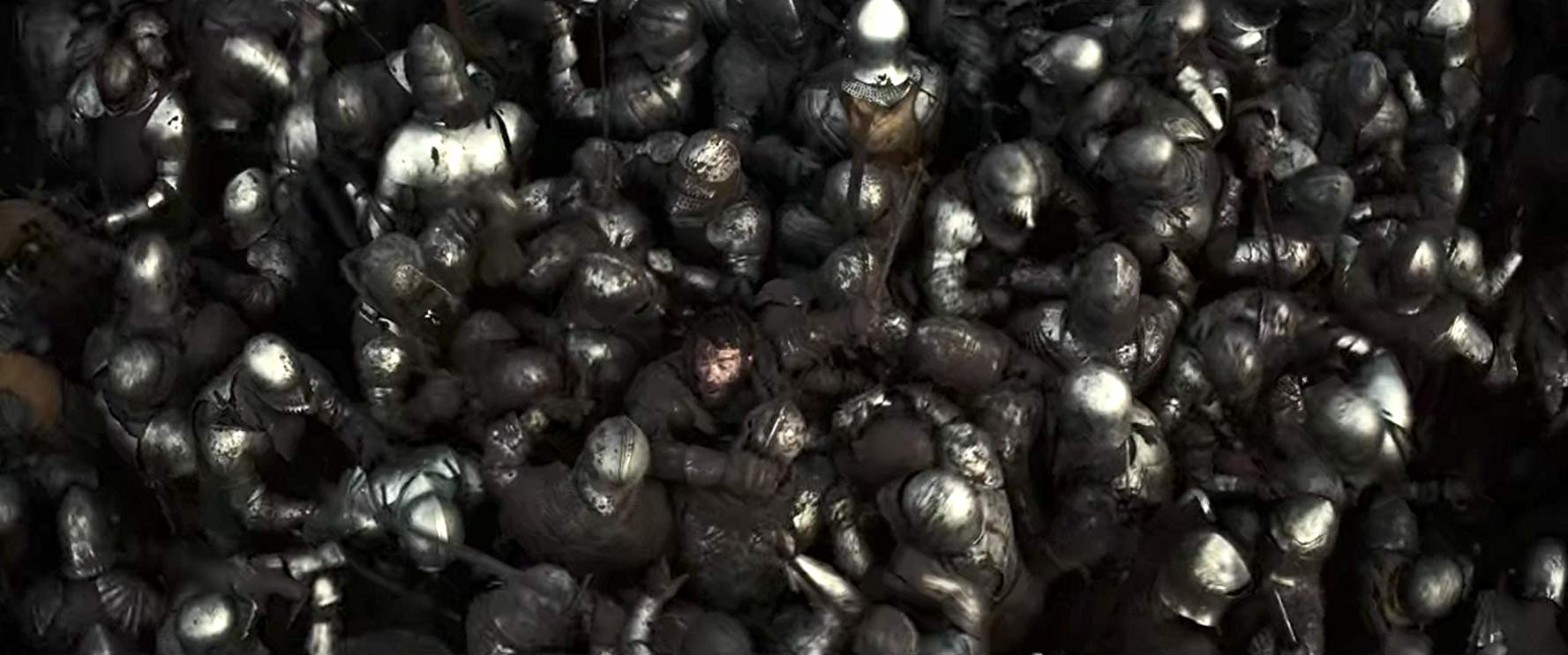 Playing babysitter to Hal is the older friend John Falstaff (Joel Edgerton, brilliant in the role and as director David Michôd’s co-writer), a fictional character from Shakespeare’s Henriad who once waged war on battle fields but now fights the demons of a desolate, drunken mind in the slop filled streets of Eastcheap. John pleads with Hal to make amends with his dwindling father, assuring him that the regret of such a festering wound might never be precisely sutured or painfully cauterized. Later on, as the hungover royal sleeps dressed in black, Chief Justice William (Sean Harris) pleads with the young usurper to visit his dying father. Hal says, “hmm, that hook has lost its worm,” and only upon being told that his brother has been killed in battle – to little shock or awe – is Hal caught and pulled awake. He should be king. He must. He is.