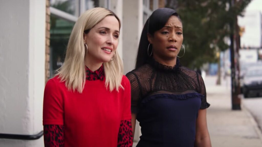 The setup is simple to the point of bordering on parody, like a bland idea for an SNL skecth given life during an uninspired week of writing. As best friends since grade school, Mel (Rose Byrne) and Mia (Tiffany Haddish) now run a beauty boutique, building out on their online sales to have a brick and mortar location. Mia is the artist of the two, blending unique colors to paint on and sell to clients, while Mel mostly crunches the numbers and tries to make fiscally responsible decisions. With a long line of accrued debt, being saved by global marketplace giant Oviedo’s CEO Claire Luna (Salma Hayek) might be the only “Shark Tank” like lifeline they have left.
